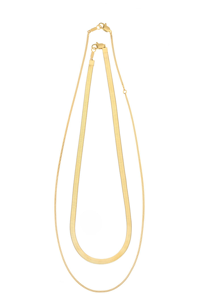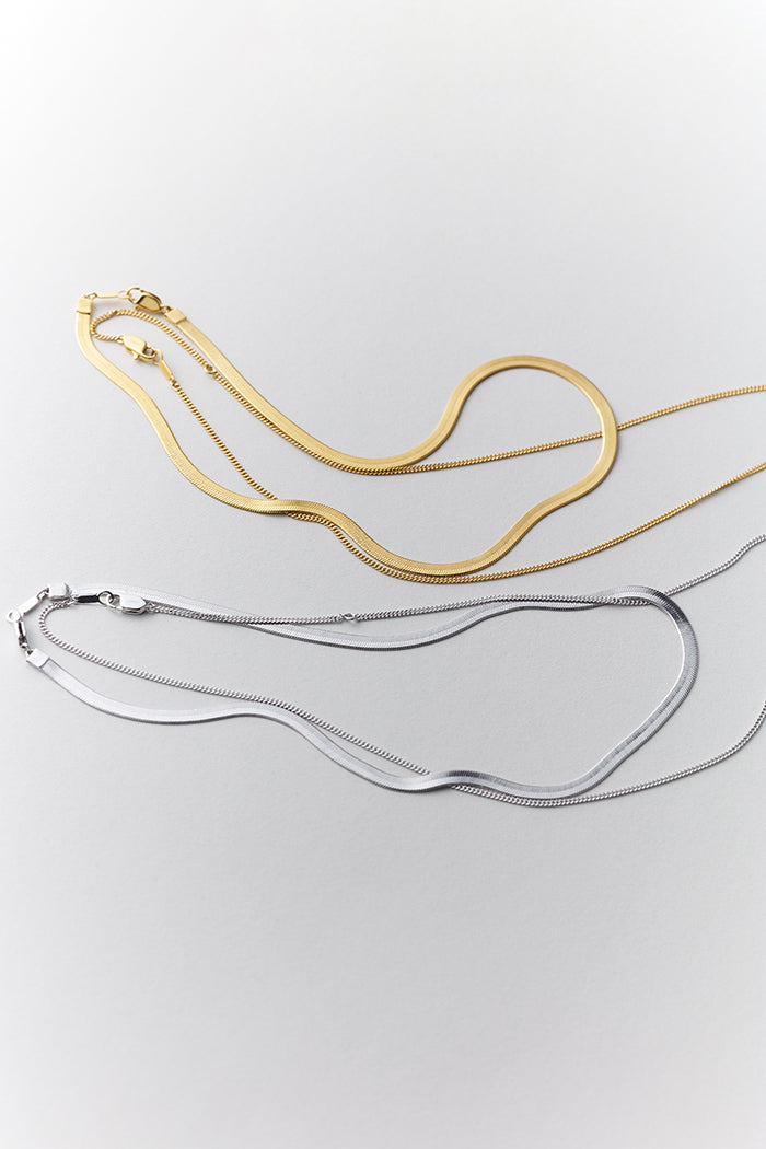 スネークチェーンと喜平チェーンのセット。それぞれで身につけても、重ねて身につけても。インパクトのあるメタルの艶に心を奪われます。